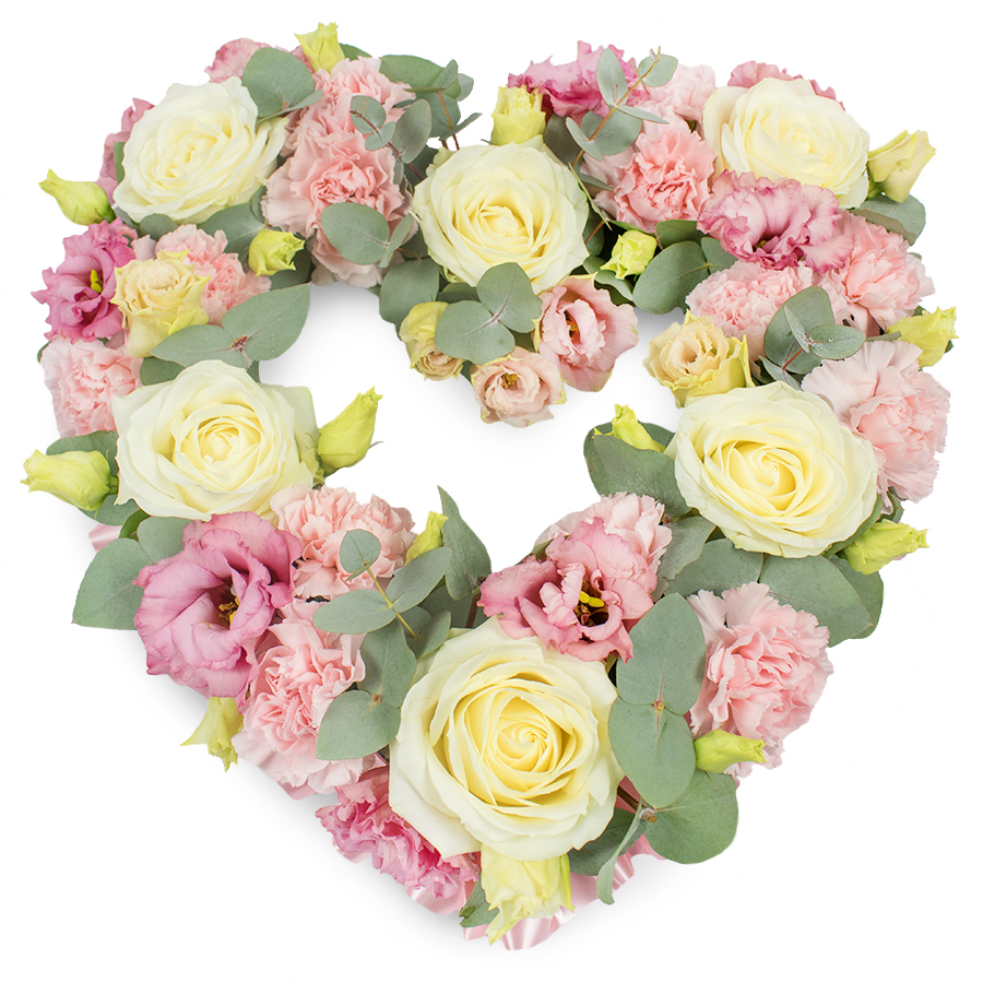 Celebrate cherished memories with our Heartfelt Floral Tribute. This exquisite bouquet features pure white roses, delicate pink carnations, graceful pink lisianthus, and fragrant eucalyptus leaves, all arranged with care to ensure maximum freshness and beauty.